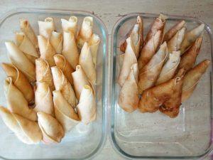 Luăm o foaie de clătită și o tăiem în 4 sau în jumătate, în funcție de dimensiunea dorită a mulelor. Puneți umplutura la colțul clătitei și răsuciți, formând un colț în vârf. Marginile de jos le introduceți înăuntru, ca la sarmale. Procedați astfel cu toate foile de clătite și cu umplutura de halva.