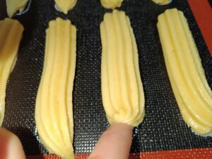 7. Într-un pahar adăugați puțină apă. Introdu un deget in apă și apăsă ușor pe marginile eclerelor pentru a avea o forma uniforma si pentru a nu se arde in timpul coacerii.