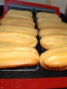 8.Coace eclerele în cuptorul preîncălzit la 200°C timp de aproximativ 20-25 de minute sau până când sunt ușor aurii și umflate, apoi redu temperatura cuptorului la 170°C, înțeapați-le cu un băț de frigăruie in părți pentru a se usca si in interior, continua coacerea pentru aproximativ 20-25 de minute. Ele trebuie sa aibă culoarea ușor brună.