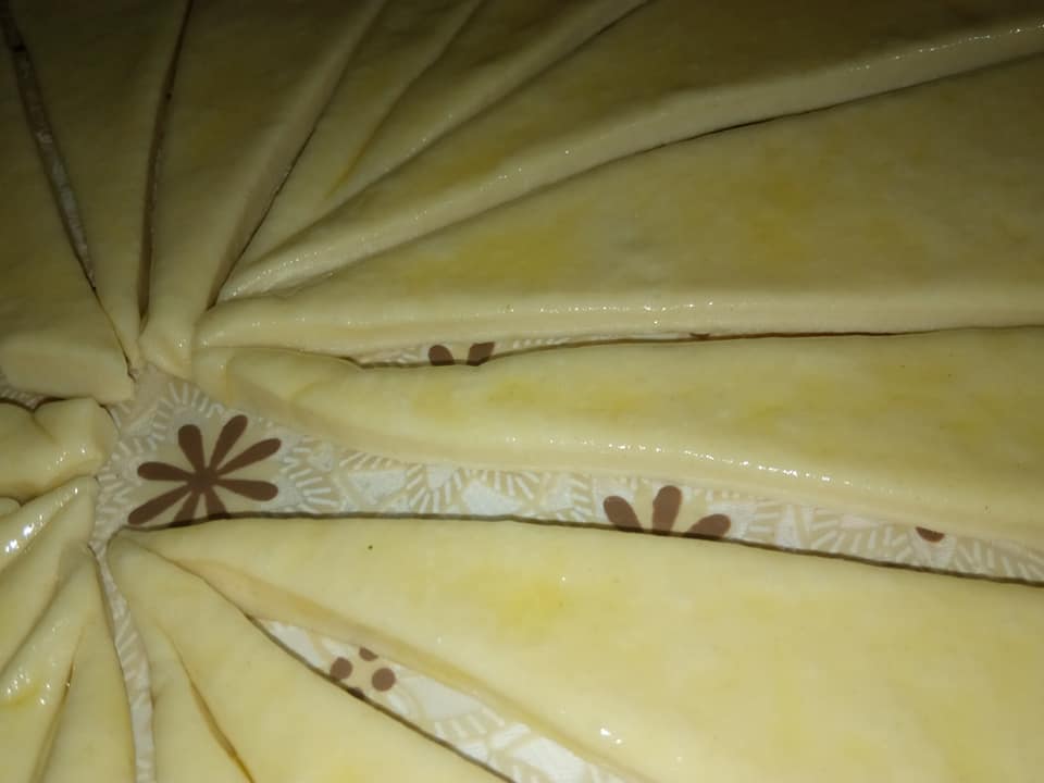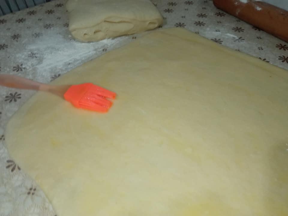Formarea triunghiurilor: Taie aluatul în două părți egale. Întinde fiecare parte într-o foaie nu foarte subțire (1-2 cm grosime) și unge-le cu unt moale.