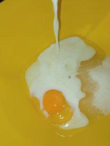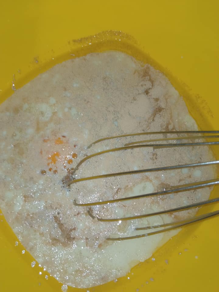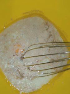 Amestecarea ingredientelor: Adaugă oul și uleiul peste amestecul de drojdie. Folosește un tel pentru a le omogeniza.