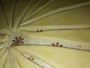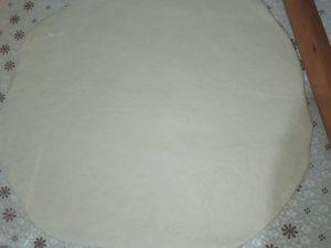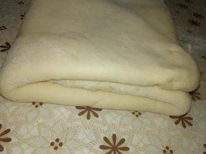 Întinderea și împachetarea: Când aluatul a crescut, presară puțină făină pe masa de lucru și întinde aluatul cu sucitorul. Împăturește-l în trei (ca un plic) și mai lasă-l 15 minute să se relaxeze.