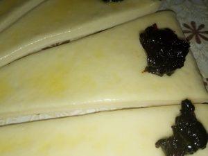 Adăugarea umpluturii: Taie foaia în triunghiuri de dimensiunea dorită, pune câte o linguriță de gem de prune cu alune la baza fiecărui triunghi și rulează-l ușor spre vârf.