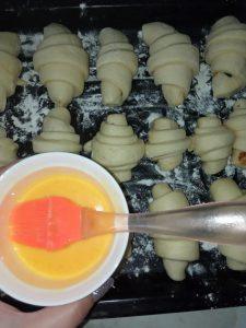 Ungerea: Într-un bol mic, amestecă gălbenușul cu laptele și unge fiecare corn cu această compoziție, folosind o pensulă.