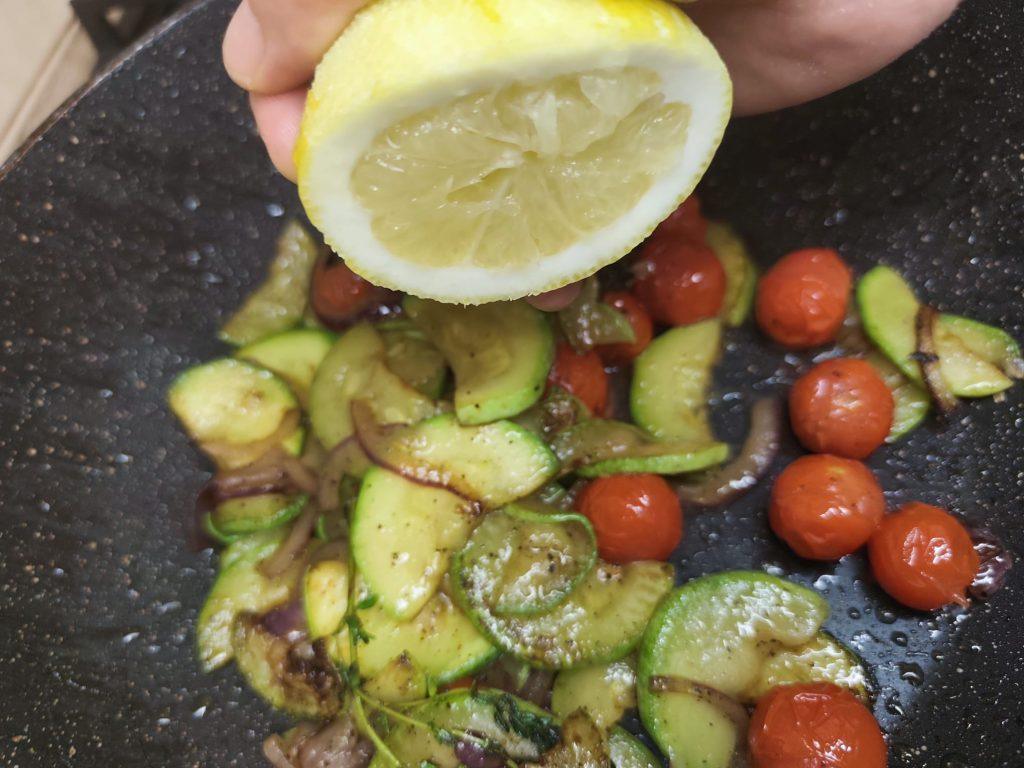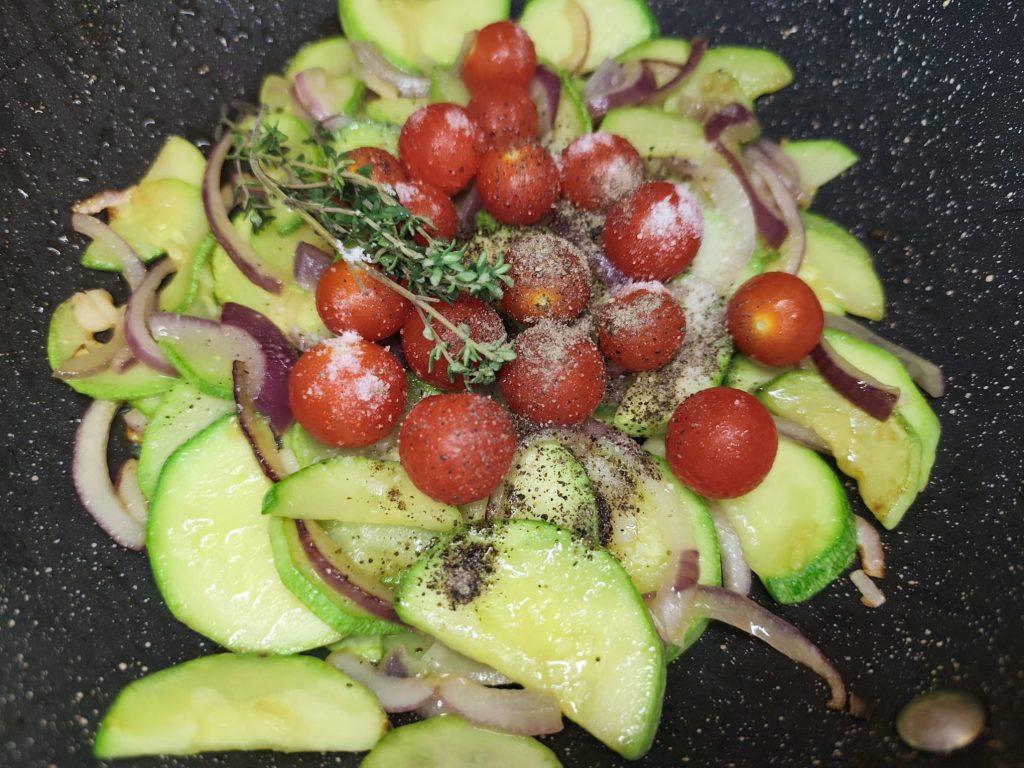 Încinge bine tigaia, adaugă uleiul, apoi ceapa și dovlecelul, gătește 2-3 minute, apoi roșiile și ierburile. Condimentează cu sare și piper.