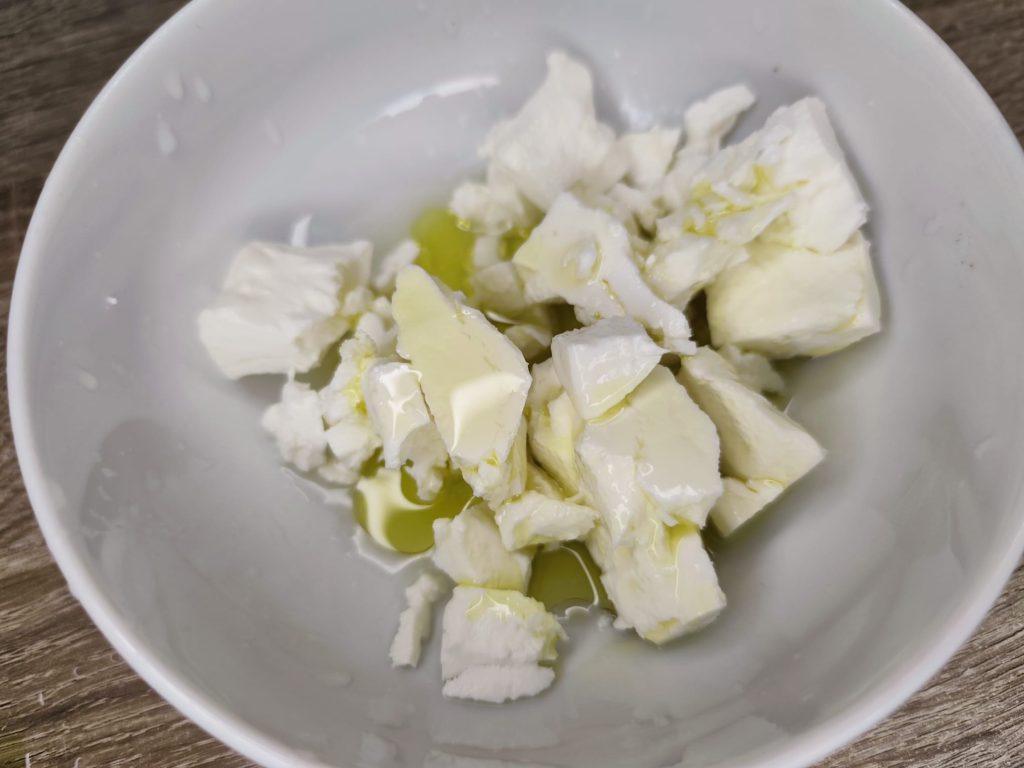 Sfărâmă feta într-un bol și amestec-o ușor cu 1 linguriță de ulei de măsline și 1–2 picături de zeamă de lămâie (nu mai mult).