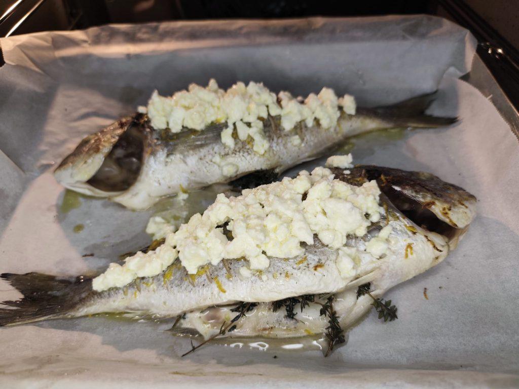Cu 3–4 minute înainte de final, scoate tava din cuptor, presară feta peste pește și mai introdu tava la cuptor.