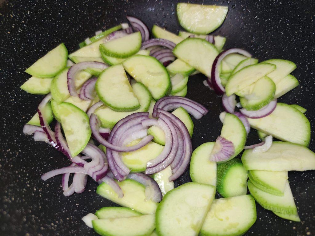 Taie ceapa julien (fâșii nu foarte subțiri), dovlecelul în felii subțiri, roșiile în jumătăți dacă sunt mărișoare sau lasă-le întregi dacă sunt mici.