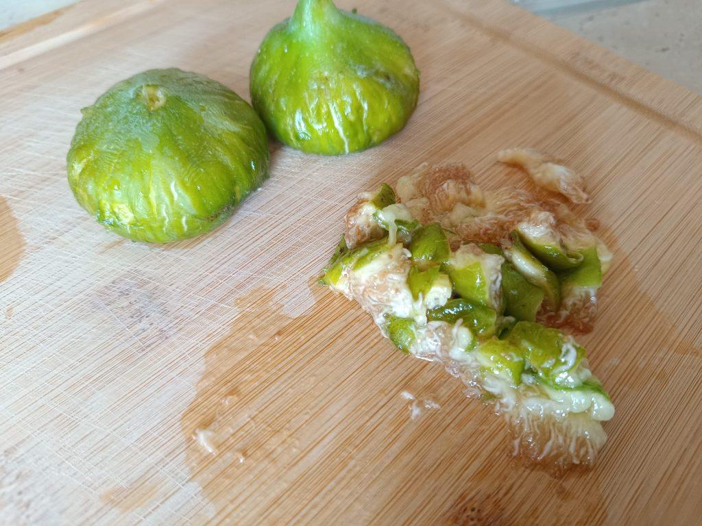 Cât timp cojile se răcesc, pregătește piureul de smochine. Spală fructele și, dacă sunt foarte coapte și moi, poți folosi și coaja, la pasare devine fină și aduce aromă. Taie pulpa în bucăți și așază-le într-o crăticioară mică pe foc foarte mic. Adaugă, dacă dorești, o lingură de miere doar pentru parfum. Ține smochinele două-trei minute, amestecând din când în când, cât să elimini umezeala în exces.
