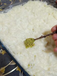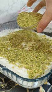Presărați o porție generoasă de nuci și fistic peste foaia de güllaç. Repetați acest proces, alternând între foi și laptele dulce, până când folosiți toate ingredientele.