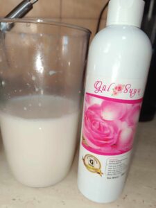 Într-un vas mare adaugati 2-3 polonice din laptele indulcit, adăugați apa de trandafiri și, opțional, apa de portocale. Acesta va fi lichidul care veți da gustul/aroma foilor de güllaç.