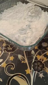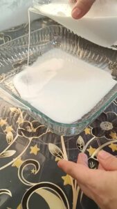 Începeți asamblarea güllaçului: intr-o tava de servire de yena așezați o foaie de güllaç în lichidul cu aromă. Asigurați-vă că acoperiți întreaga suprafață a vasului cu foaia de güllaç. Continuati adaugand foaie, lapte dulce si tot asa pana folositi jumatate din cantitatea foilor.