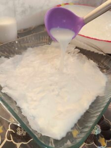 După ce ați așezat ultima foaie de güllaç, turnați laptele dulce peste desert. Asigurați-vă că toate foile sunt complet acoperite cu lapte.