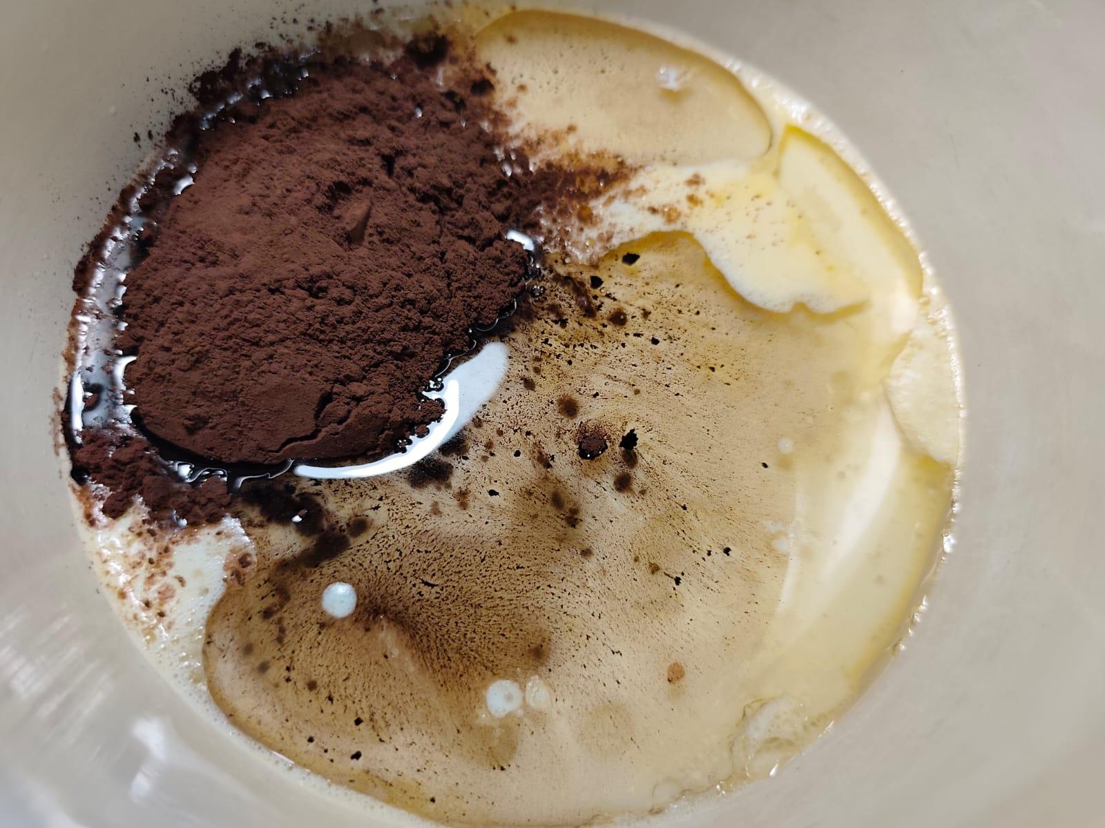 Se adaugă apoi cacaoa, zahărul vanilinat și praful de copt. Este bine ca aceste ingrediente să fie presărate treptat, nu toate odată, pentru a evita formarea cocoloașelor. Se amestecă din nou, dar fără grabă.