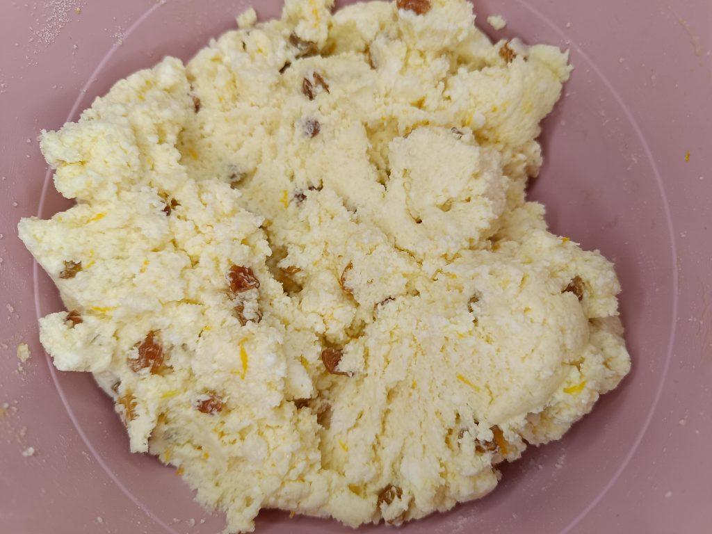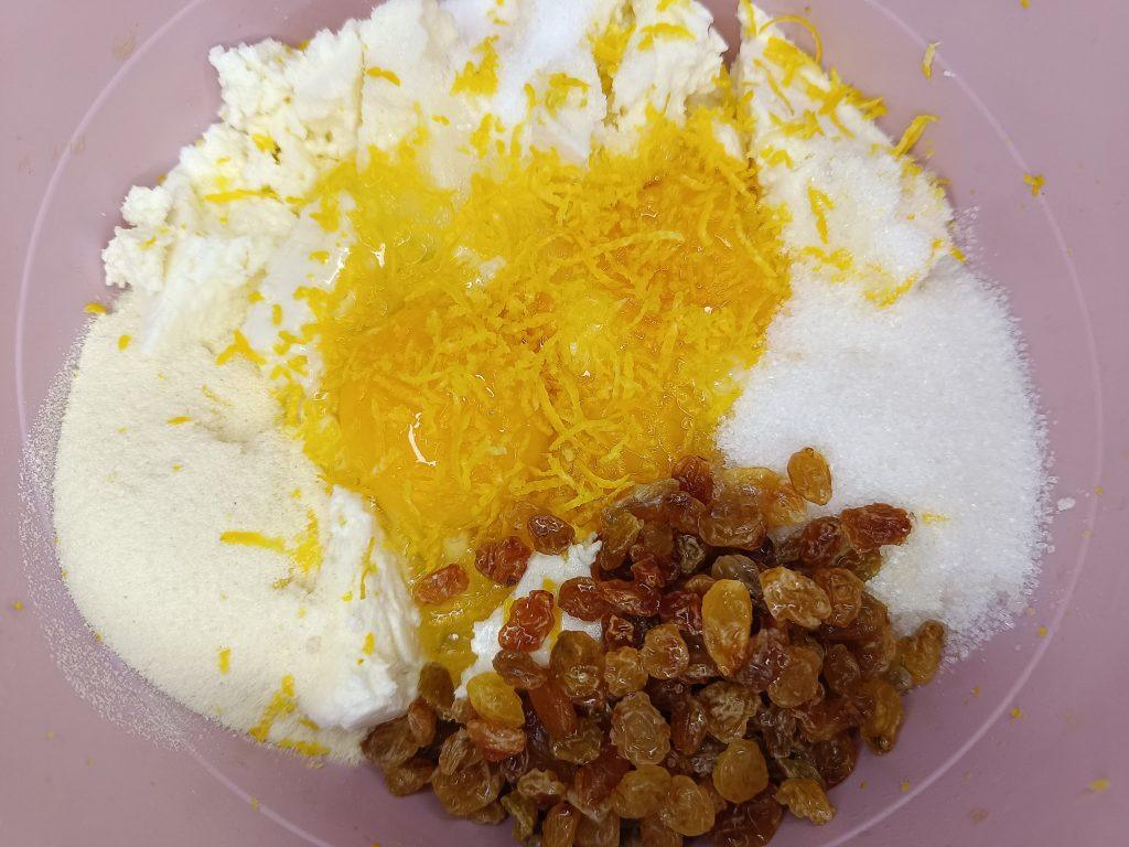 Într-un bol curat, pune brânza dulce scursă și amestec-o cu ouăle, zahărul pudră, zahărul vanilat, grișul, coaja de lămâie și stafidele. Lasă compoziția câteva minute, ca grișul să absoarbă lichidul și să devină cremoasă, dar nu apoasă.
