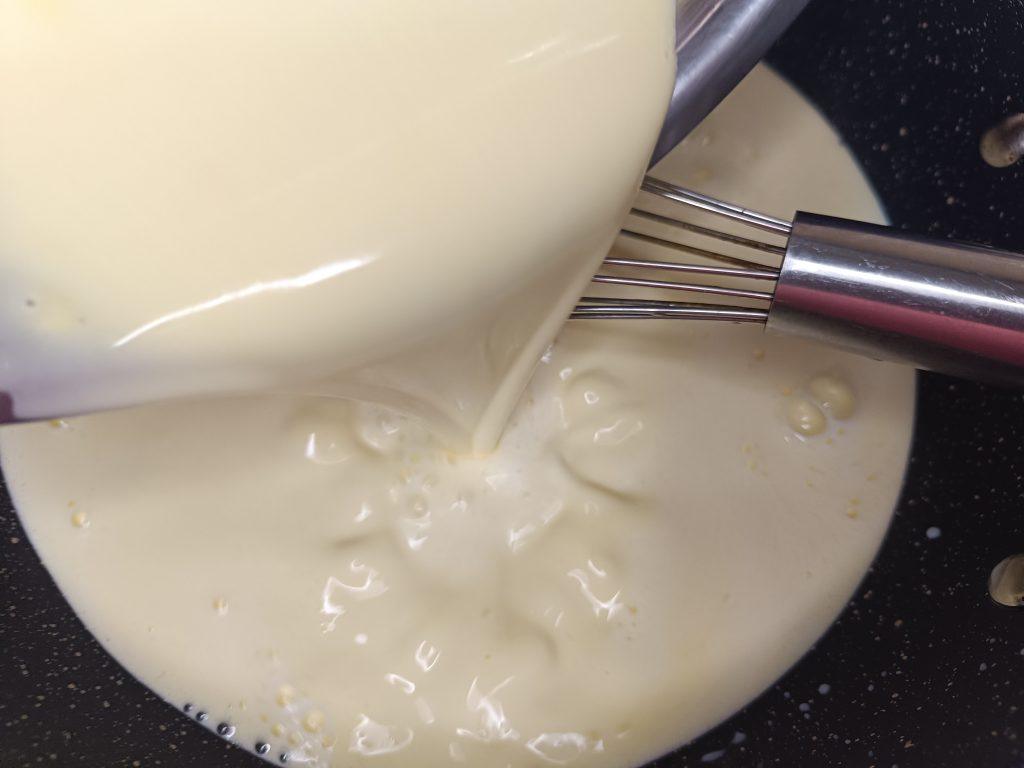 Torni apoi amestecul înapoi în cratiță peste restul de lapte. Pui cratița pe foc mic și amesteci neîncetat până când sosul capătă consistența unei creme subțiri.