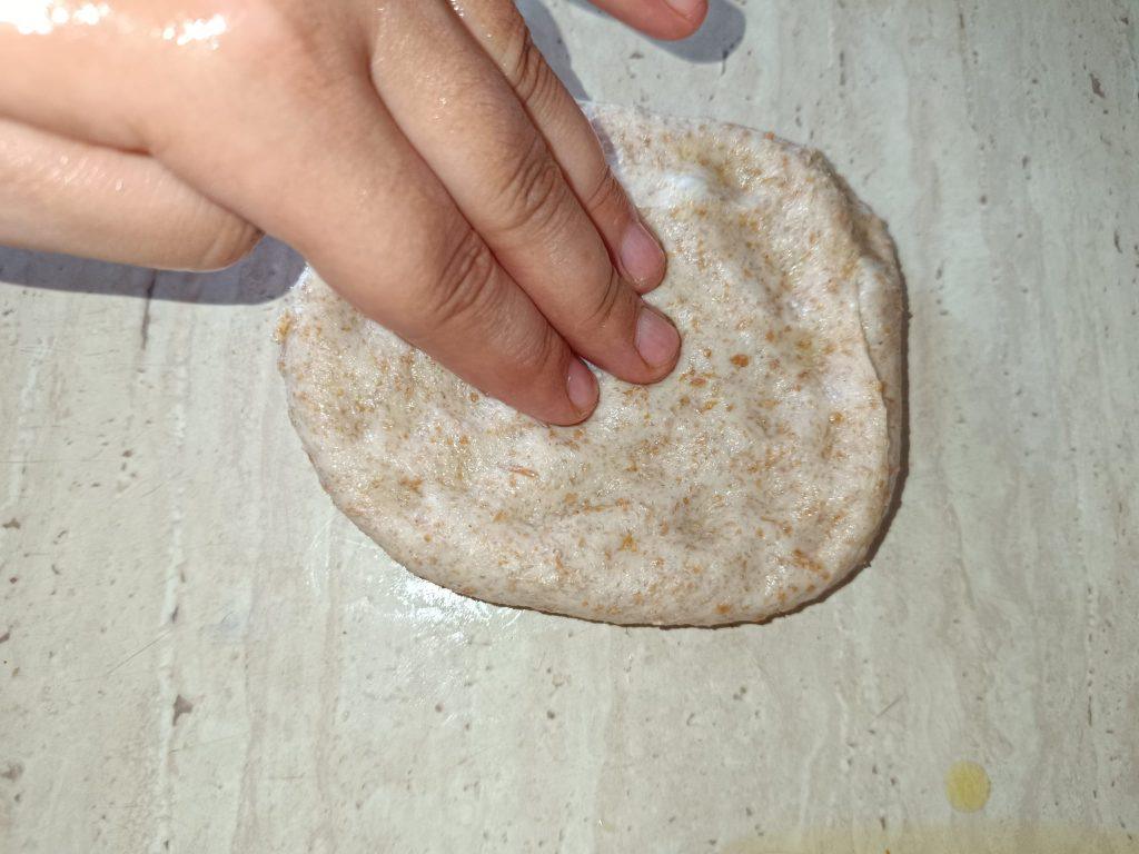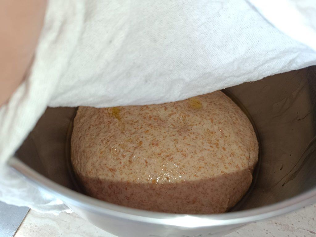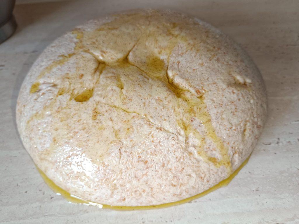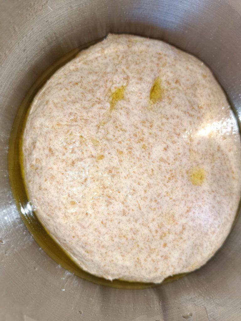 Se unge un bol mare cu ulei, se așază aluatul în el, se întoarce pe toate părțile să se acopere cu un strat subțire de ulei și se acoperă cu un prosop umed. Se lasă la dospit aproximativ 2 ore, până când își dublează volumul.
