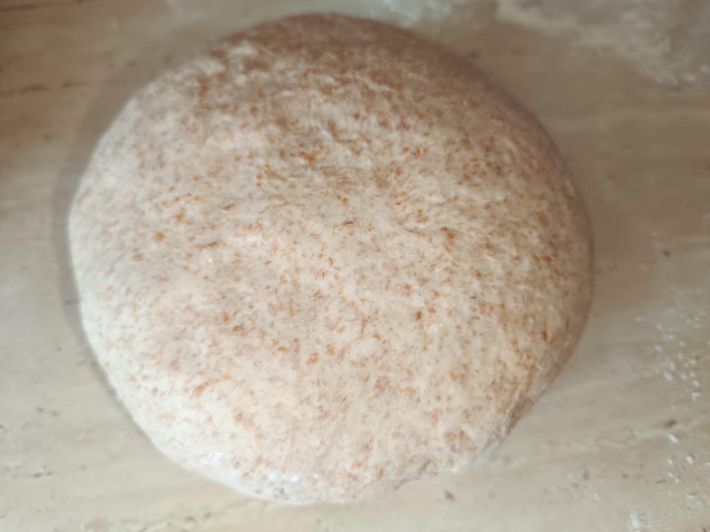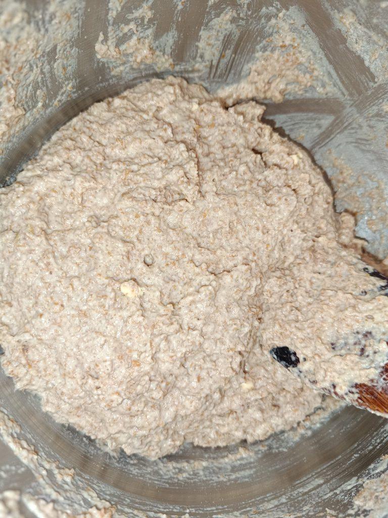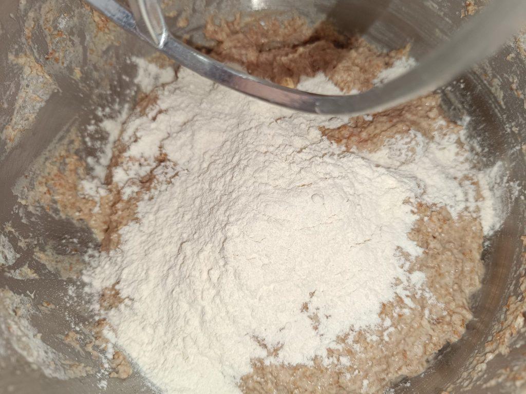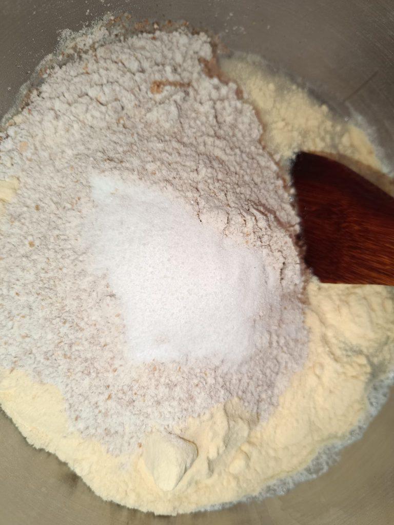 Se adaugă treptat făina integrală, sarea și laptele praf, amestecând cu o lingură de lemn. Aluatul va fi moale și lipicios, dar nu trebuie să te sperii, acesta este specificul aluaturilor cu făină integrală. Se adaugă apoi făina albă, puțin câte puțin, până când aluatul devine mai ușor de lucrat. Nu trebuie să fie tare, dimpotrivă, trebuie să rămână moale, ca atunci când apeși cu degetul să își revină imediat la formă.