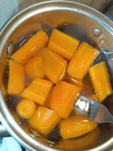 După fierbere, scurge morcovii, păstrând 50 ml din apa în care au fiert, pentru a ajusta consistența piureului, dacă este nevoie.