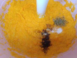 Adaugă sare, piper și opțional miere sau zahăr. Pentru o notă unică, presară un praf de nucșoară, condimente de provence sau ghimbir.