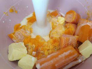 Pune morcovii într-un blender sau folosește un pasator manual. Adaugă untul și laptele treptat, amestecând până obții o textură fină. Dacă piureul e prea gros, poți adăuga puțin din apa păstrată.