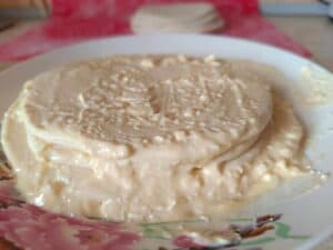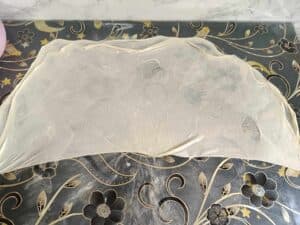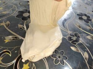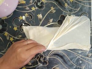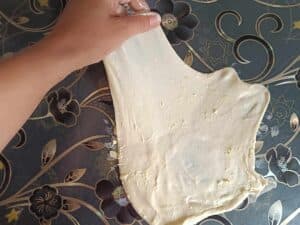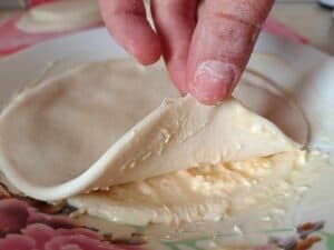 Întinderea foilor: După odihnă, întinde fiecare bilă de aluat cu mâna, trăgând ușor până devine transparentă. Foaia subțire se pliază pe jumătate, dacă foaia este prea mare, o puteți tăia pe jumătate, iar în mijloc se pune umplutura de brânză și ou.