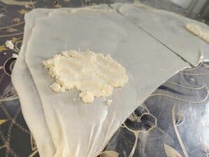 Întinderea foilor: După odihnă, întinde fiecare bilă de aluat cu mâna, trăgând ușor până devine transparentă. Foaia subțire se pliază pe jumătate, iar în mijloc se pune umplutura de brânză și ou.