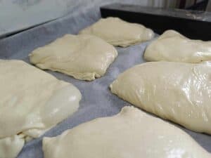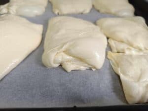 Formarea plăcintelor: Împăturește foile cu umplutură și „trântește” plăcintele în tavă – da, chiar o „trântești”! . Acest gest tradițional ajută la distribuirea uniformă a aluatului și contribuie la textura aerată a plăcintelor. Lasă-le să se odihnească timp de 20 de minute înainte de coacere.