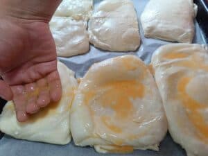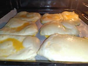 Coacerea: Bate 2 ouă și unge fiecare plăcintă folosind dosul mâinii, dându-le totodată și formă. Coace plăcintele în cuptorul preîncălzit la 220°C timp de 20 de minute, până devin aurii și crocante.